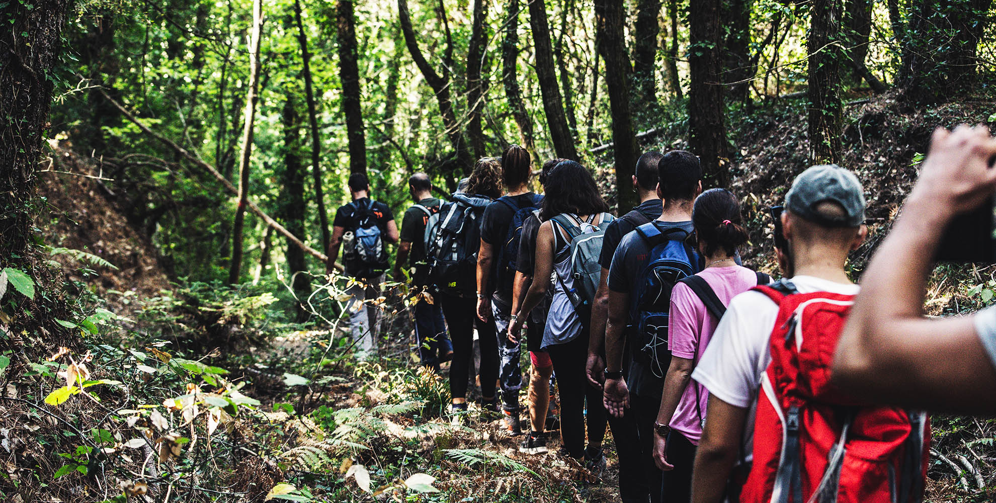 Πεζοπορία στο μονοπάτι με την οργιώδη βλάστηση και τα πανύψηλα δέντρα του δάσους